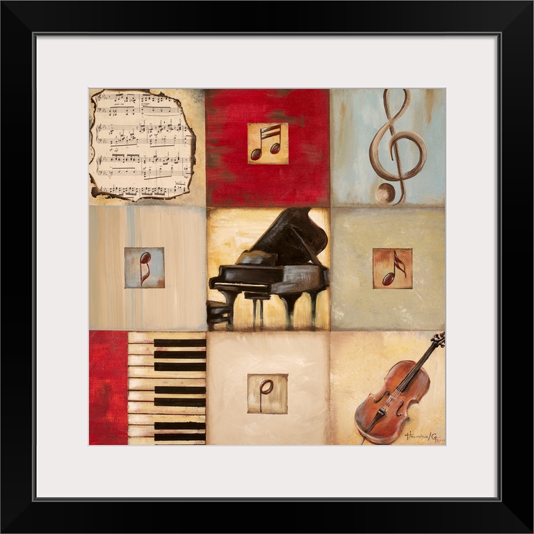 <p>Giant canvas art is set to a musical theme that has been divided into nine separate squares. Located within the squares are a piano, violin, various musical notes and sheet music.</p>