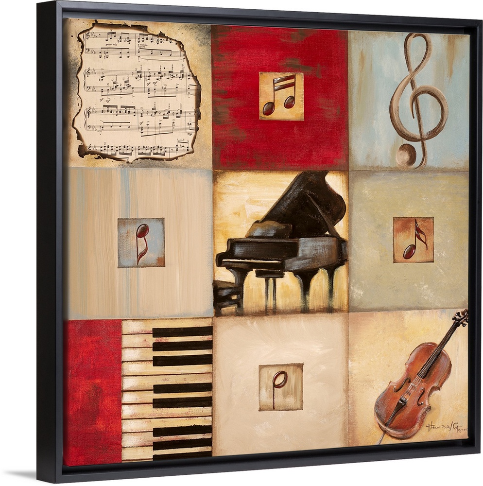 <p>Giant canvas art is set to a musical theme that has been divided into nine separate squares. Located within the squares are a piano, violin, various musical notes and sheet music.</p>