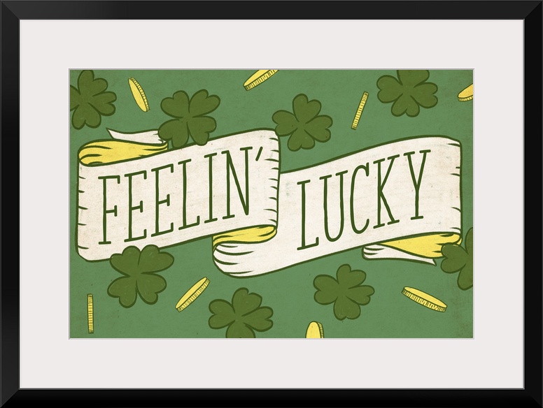 <p>"Feelin' Lucky" written on a banner with gold coins and four-leaf clovers on a green background.</p>