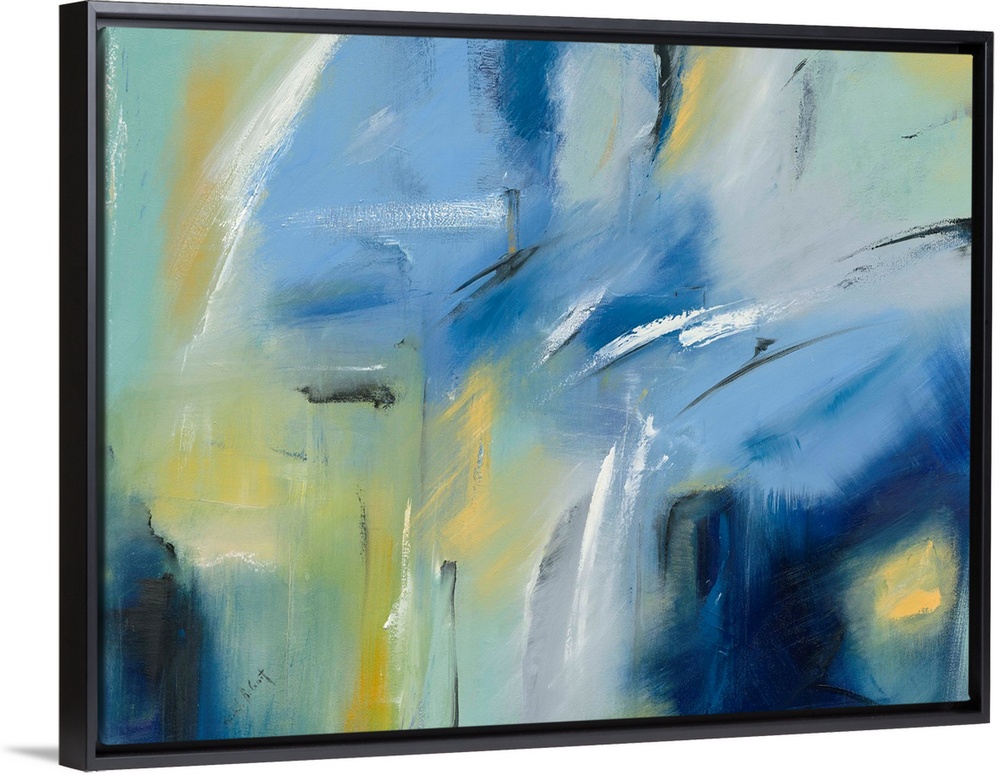 <p>Large blue, green, and yellow abstract painting with black and white brushstrokes on top creating movement.</p>