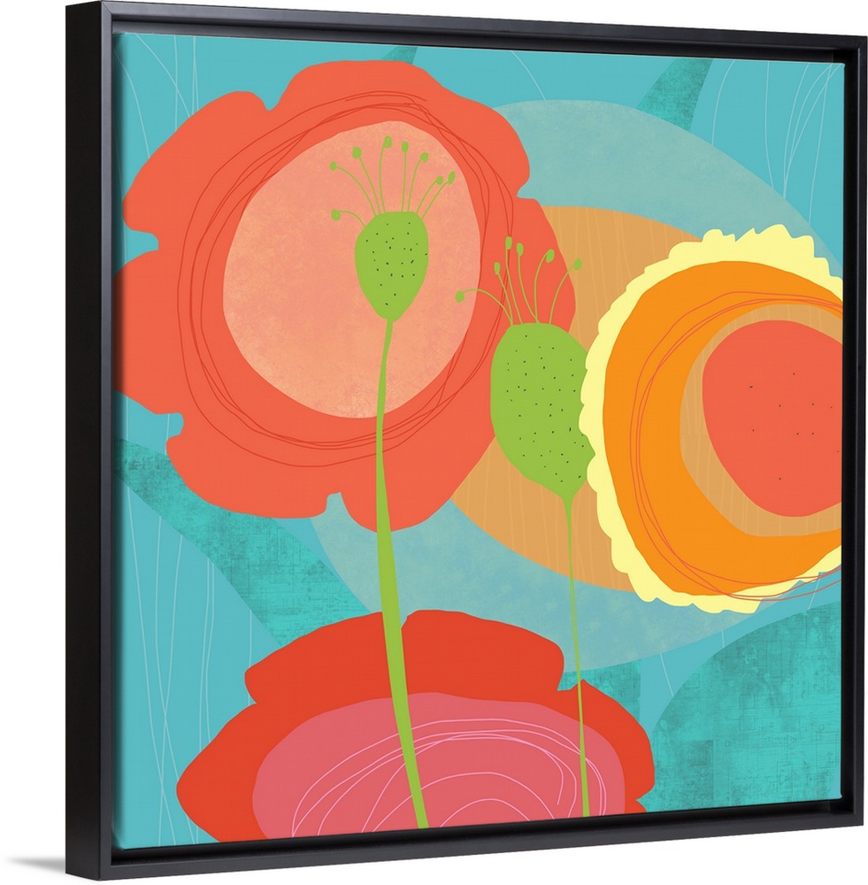 <p>Pop flowers floating in a soft aqua background. Bright pink and yellow and orange jump out ion this pop art piece. Perfect for family room, lobby, kitchen and any active area. Check out its mate too.</p>