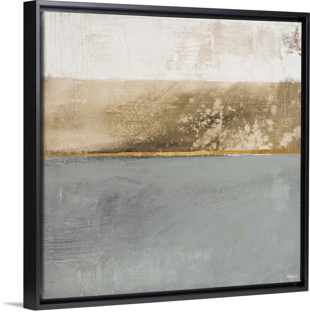 <p>Square abstract painting with three sections of color: dark gray, brown, and white and one thin metallic gold line running through the middle like a horizon line.</p>