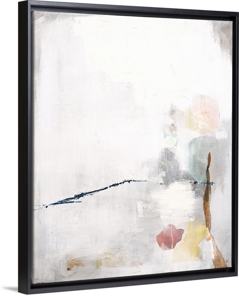 <p>Large abstract art with faint hints of color underneath a white and gray overlay with a thin blue streak running horizontally on top.</p>