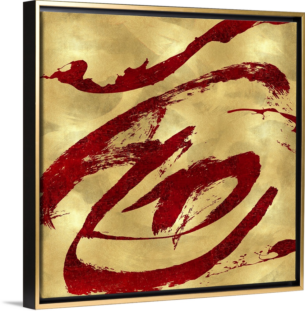 <p>Gestural and energetic brush strokes in red decorate a mottled gold color background in this contemporary artwork.</p>