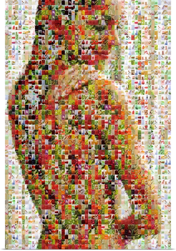 <p>Vertical, oversized art of a female figure that is made up of very small pictures of healthy food.</p>