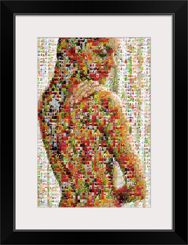 <p>Vertical, oversized art of a female figure that is made up of very small pictures of healthy food.</p>