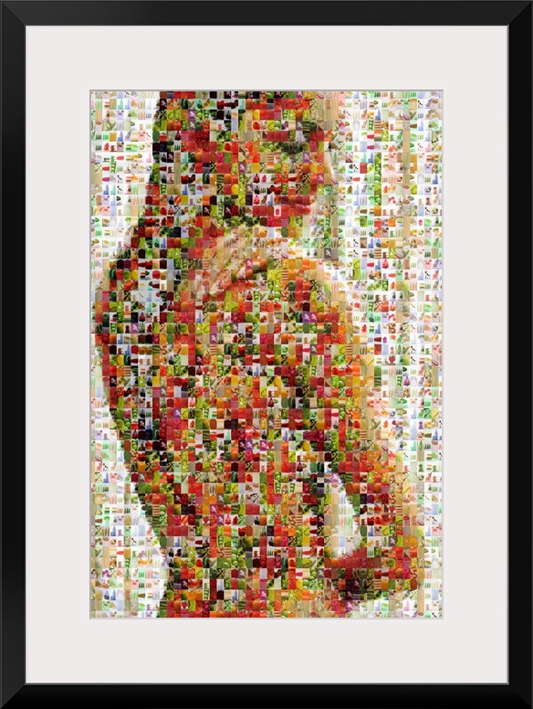 <p>Vertical, oversized art of a female figure that is made up of very small pictures of healthy food.</p>