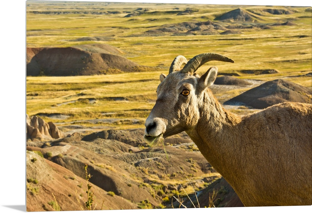 <p>female Bighorn Sheep; in landscape; Badlands Loop Road; Badlands National Park; South Dakota; USA</p>