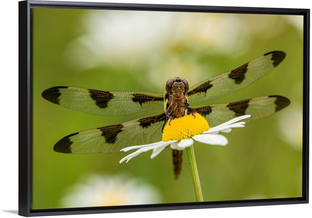 <p>Female Blue Dasher dragonfly on daisy, Pachydiplax longipennis, Kentucky</p>