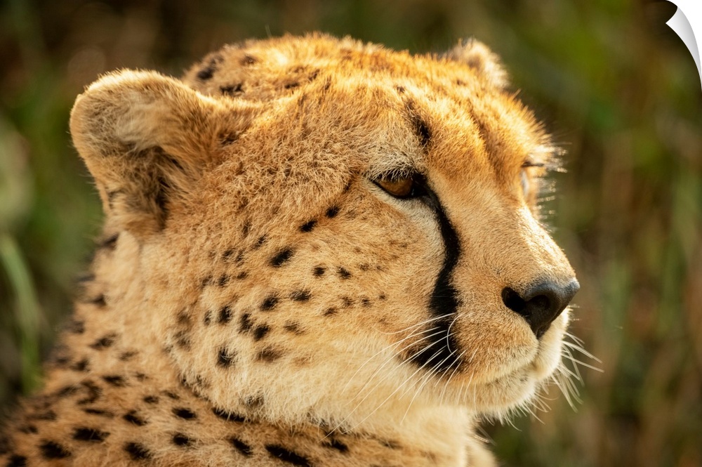 <p>Close-up of female cheetah (acinonyx jubatus) head facing right, klein's camp, Serengeti national park, Tanzania.</p>