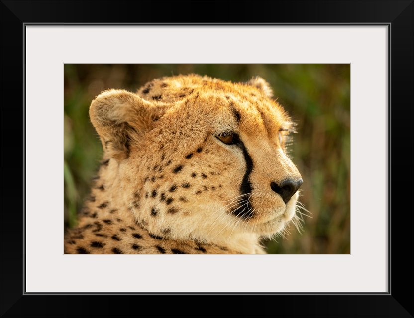 <p>Close-up of female cheetah (acinonyx jubatus) head facing right, klein's camp, Serengeti national park, Tanzania.</p>