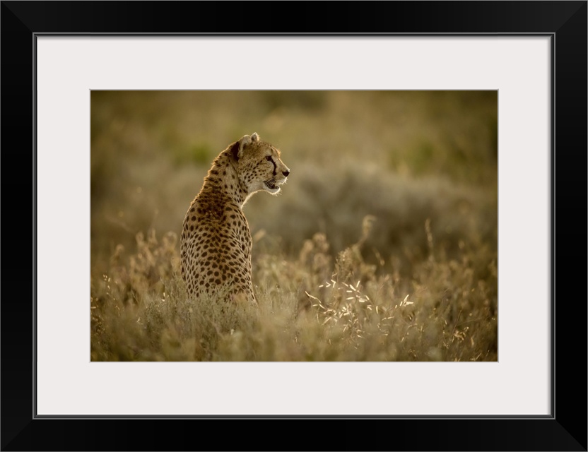 <p>Female cheetah (acinonyx jubatu) sits in grass facing right, Serengeti national park, Tanzania.</p>