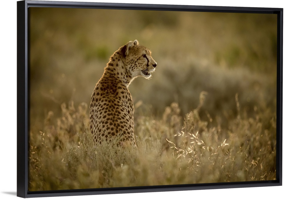 <p>Female cheetah (acinonyx jubatu) sits in grass facing right, Serengeti national park, Tanzania.</p>