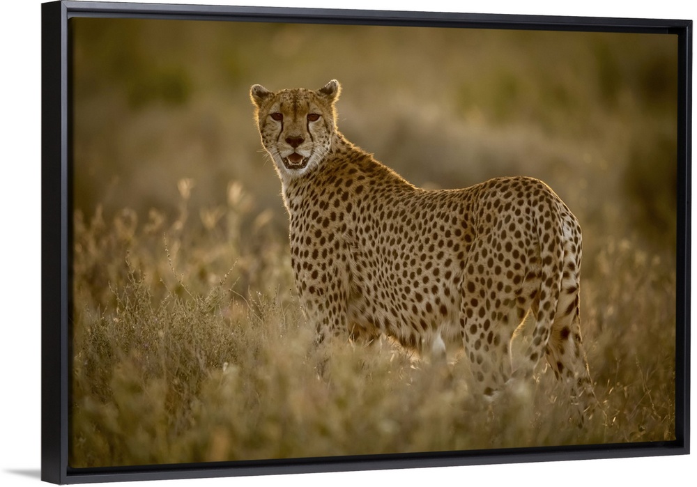 <p>Female cheetah (acinonyx jubatu) stands in grass watching camera, Serengeti national park, Tanzania.</p>
