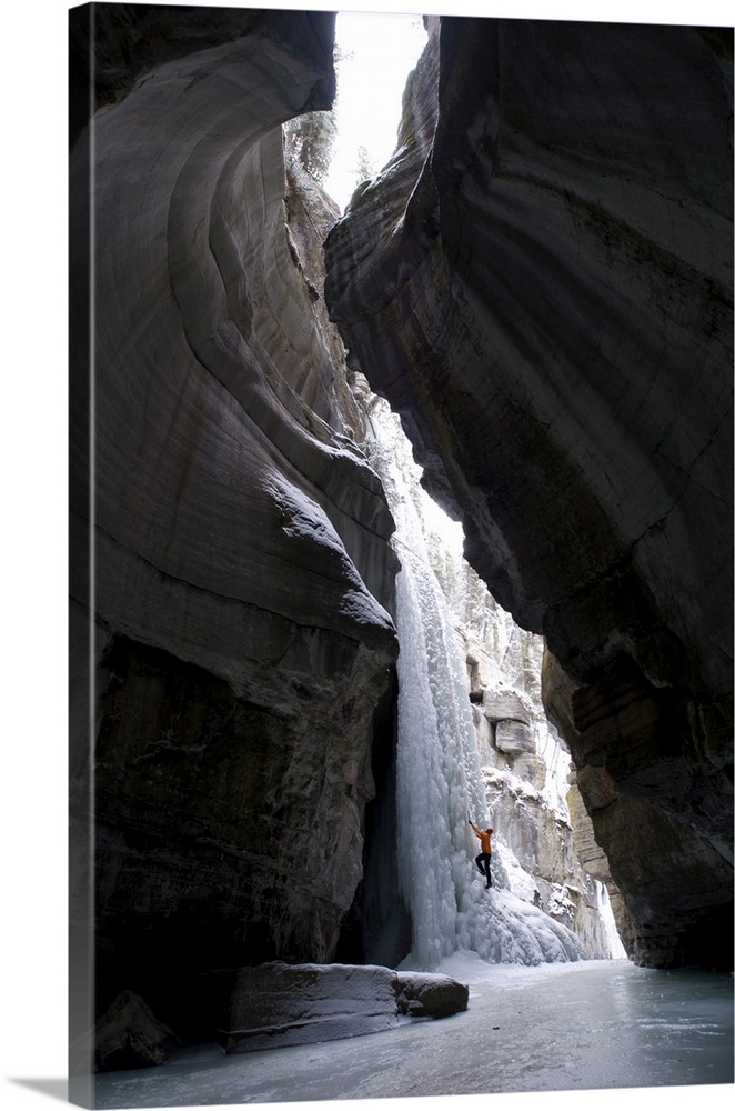 <p>Female Climber Explores Ice Climbing In The Narrows Of Maligne Canyon In Jasper National Park, Alberta, Canada</p>