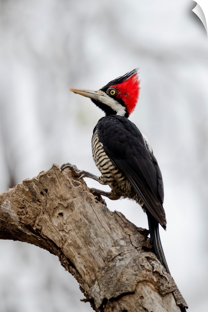 <p>South America, Brazil, The Pantanal, crimson-crested woodpecker, Campephilus melanoleucus. Female crimson-crested woodpecker near the nest hole having fed its young.</p>