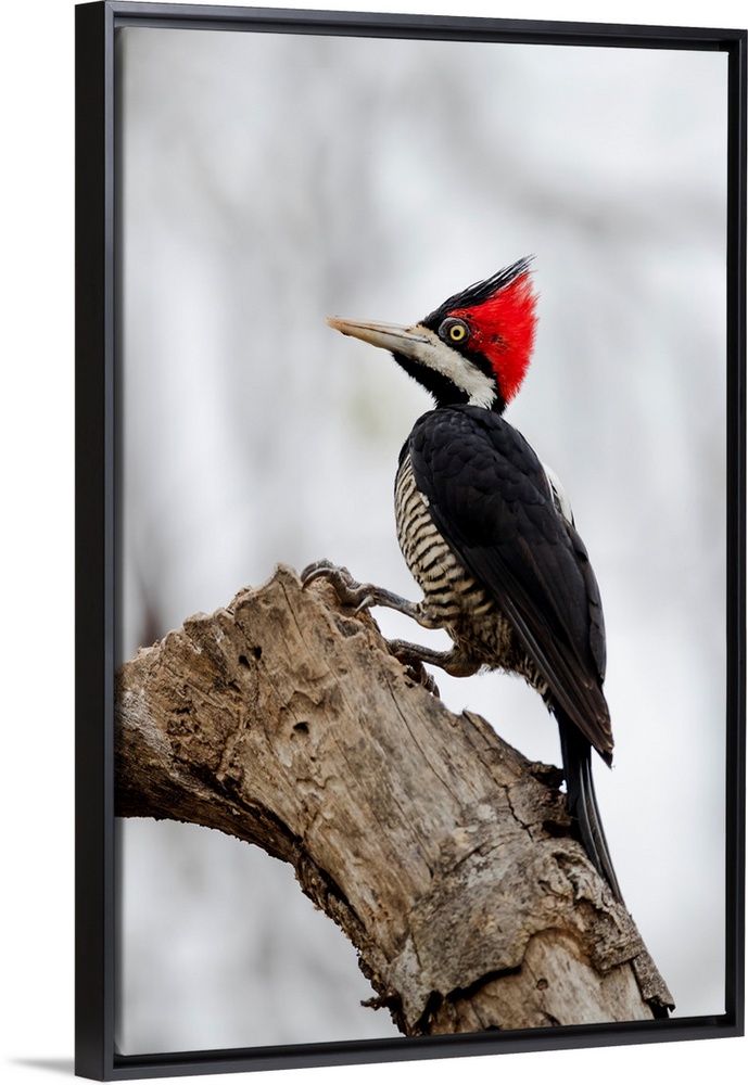 <p>South America, Brazil, The Pantanal, crimson-crested woodpecker, Campephilus melanoleucus. Female crimson-crested woodpecker near the nest hole having fed its young.</p>