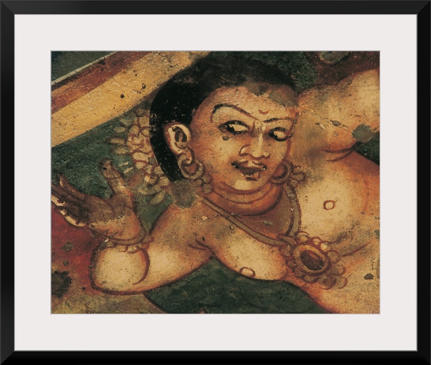 <p>INDIA. Ajanta. Ajanta Caves. Detail with a feminine figure. Wall painting inside the cave n. 2 (5th-6th c.). Hindu art. Gupta period. Painting. -</p>