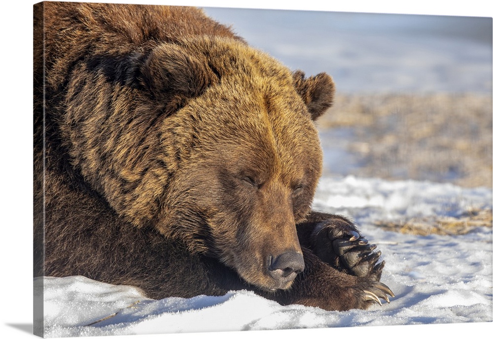 <p>Female Grizzly bear (Ursus arctic sp.) resting in the snow, Alaska Wildlife Conservation Center, South-central Alaska; Portage, Alaska, United States of America</p>
