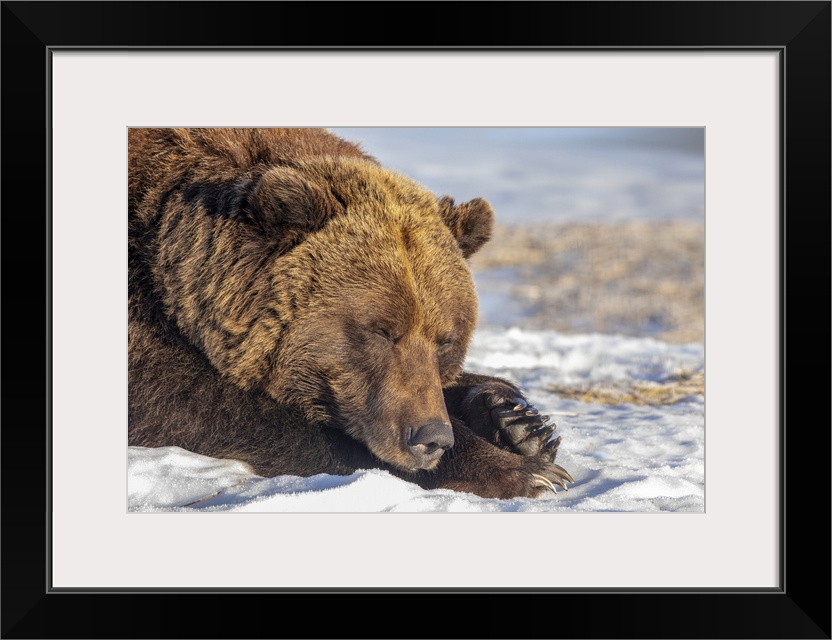 <p>Female Grizzly bear (Ursus arctic sp.) resting in the snow, Alaska Wildlife Conservation Center, South-central Alaska; Portage, Alaska, United States of America</p>
