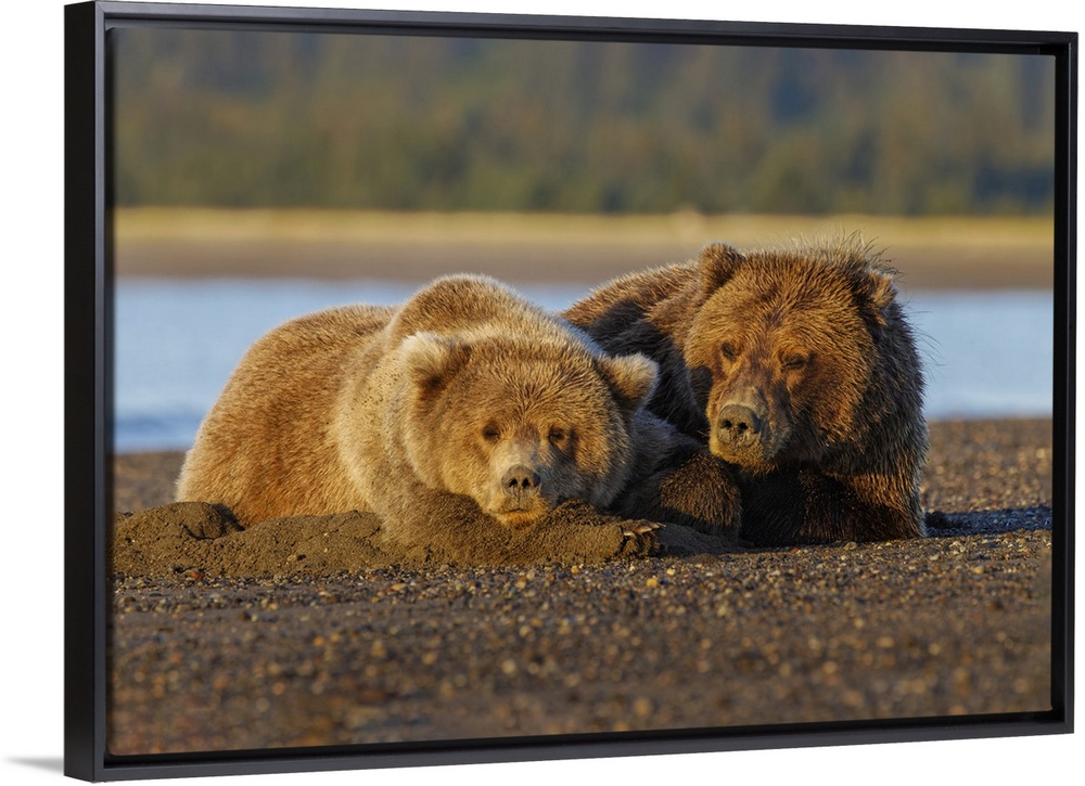 <p>Adult female grizzly bear and cub sleeping together on beach at sunrise, Lake Clark National Park and Preserve, Alaska. United States, Alaska.</p>