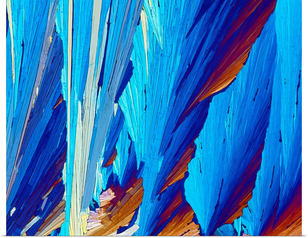 <p>Female sex hormone. Polarised light micrograph of crystals of Oestradiol, also known as beta- Estradiol. This is the most potent of the six naturally-occurring oestrogens, the class of hormones associated with the development of female reproductive structures and secondary sex characteristics (such as breast formation). Oestradiol is secreted by the ovaries, and is the major controlling hormone in the regulation of the menstrual cycle. In men excessive production of oestradiol leads to feminization. Magnification: x20 at 6x7cm size.</p>