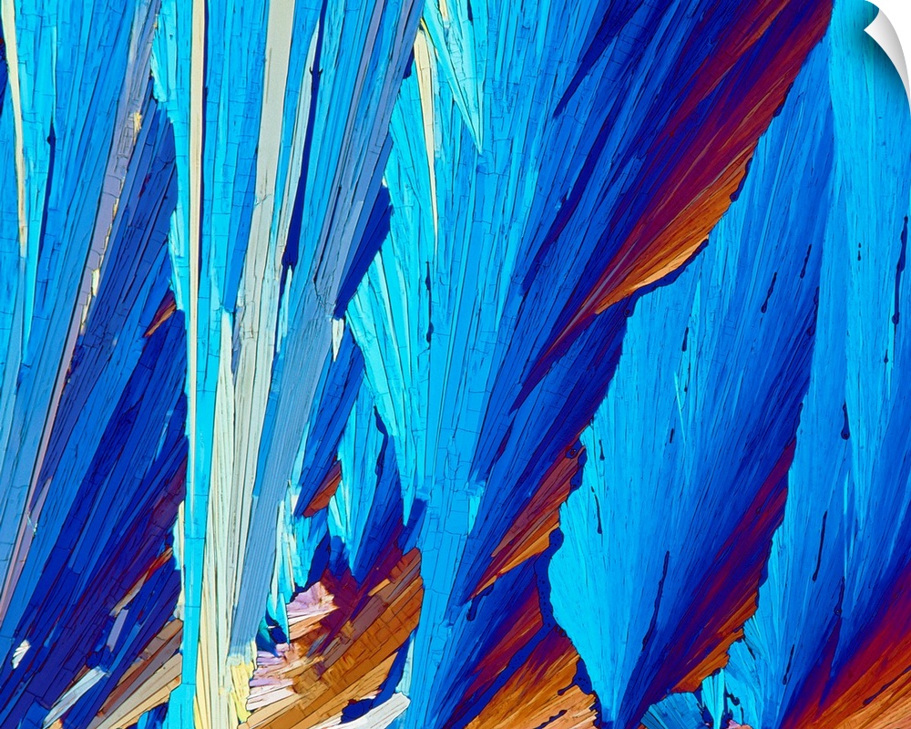 <p>Female sex hormone. Polarised light micrograph of crystals of Oestradiol, also known as beta- Estradiol. This is the most potent of the six naturally-occurring oestrogens, the class of hormones associated with the development of female reproductive structures and secondary sex characteristics (such as breast formation). Oestradiol is secreted by the ovaries, and is the major controlling hormone in the regulation of the menstrual cycle. In men excessive production of oestradiol leads to feminization. Magnification: x20 at 6x7cm size.</p>