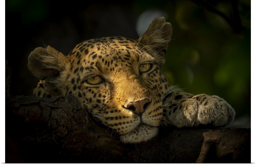 <p>Close-up portrait of a female leopard (Panthera pardus) lying in dappled sunlight with her head resting on a tree branch, watching the camera in Chobe National Park, Chobe, Botswana</p>