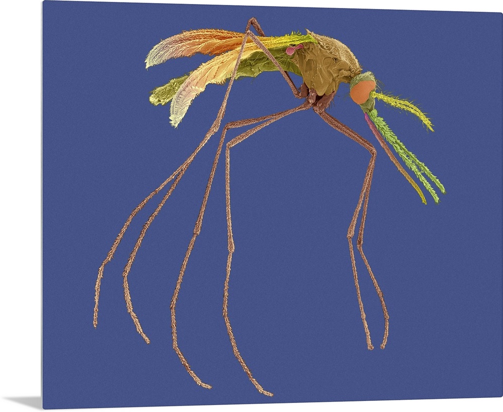 <p>Coloured scanning electron micrograph (SEM) of Female mosquito with prominent antenna, maxillary palps and proboscis (Anopheles sp.). It is a known malaria carrier. Anopheles is a genus of mosquito from the family Culicidae. There are approximately 400 species of the Anopheles mosquito, 30 to 40 transmit four different species of the parasite, Plasmodium, that causes malaria. Malaria is one of the most common infectious diseases and an enormous public-health problem. The most serious forms of the disease are caused by P. falciparum and P. vivax. The parasites, transmitted by the female mosquito when she sucks blood, multiply within red blood cells, causing symptoms that include symptoms of anaemia, as well as other general symptoms such as fever, chills, nausea, flu-like illness, coma and death. Magnification: x2 when shortest axis printed at 25 millimetres.</p>
