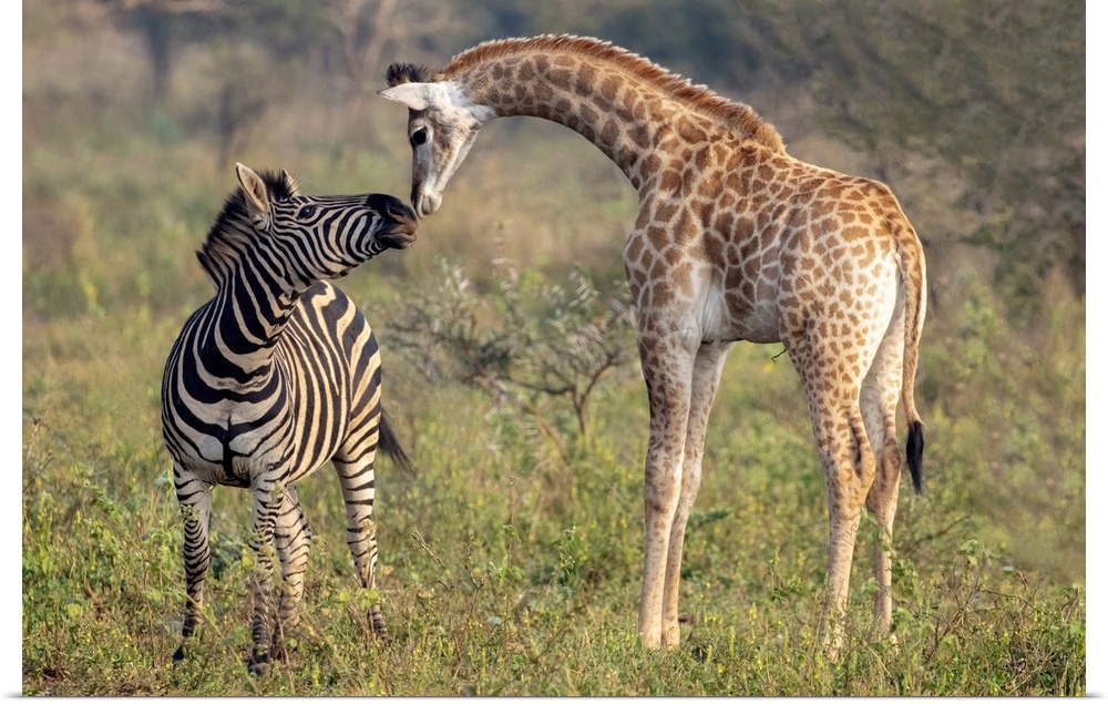 <p>Female zebra interacting with giraffe calf, Zimanga Private Game Reserve, Natal, South Africa</p>