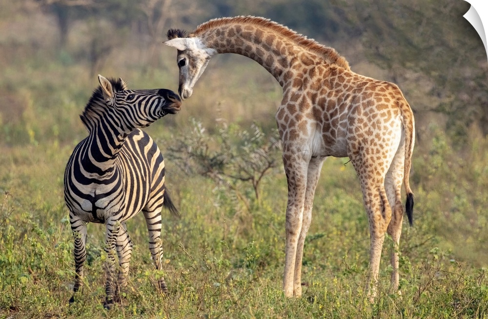 <p>Female zebra interacting with giraffe calf, Zimanga Private Game Reserve, Natal, South Africa</p>