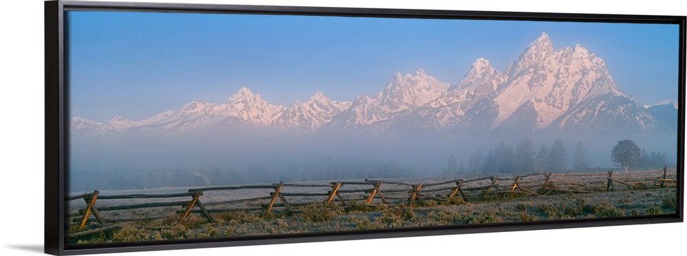 <p>Fence in a field with a mountain range in the background at sunrise, Teton Range, Grand Teton National Park, Wyoming, USA.</p>