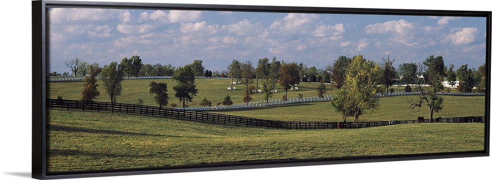 <p>Horse pastures in Lexington KY. Horse pastures with white and black fences on the Blue Grass Tour in Lexington, KY.</p>