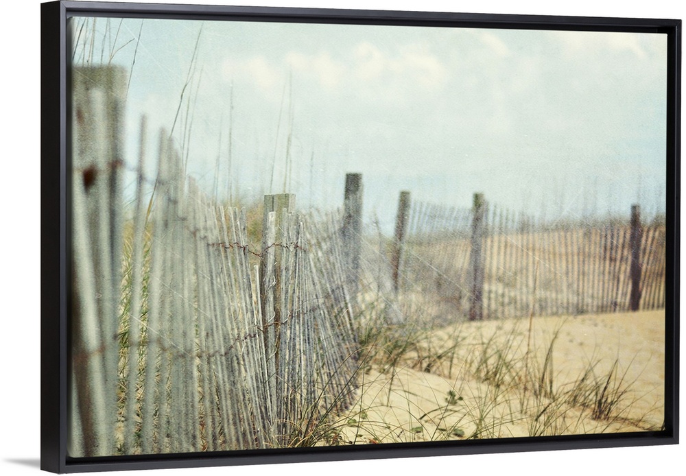 <p>Photograph of wooden fence and tall grass on hills of sand at the coast under cloudy skies.</p>