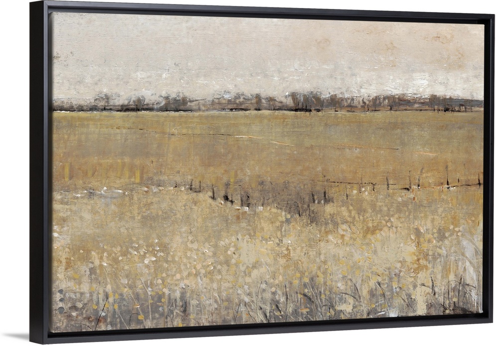 <p>Contemporary painting of a meadow with a small fence running through it.</p>