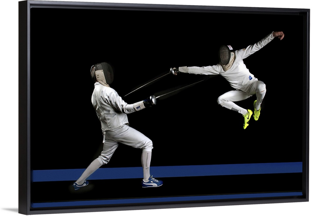 <p>Two people fencing, one leaping into the air to strike.</p>