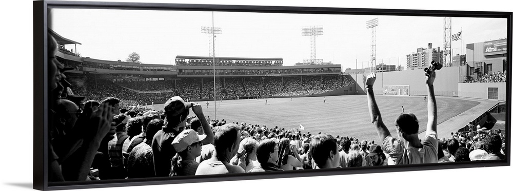 <p>Big, panoramic black and white photograph of Fenway Park in Boston, with fans standing and cheering in the foreground.</p>