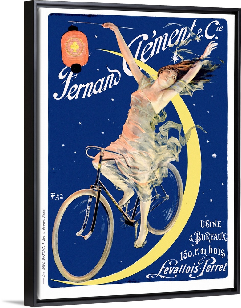 <p>Big, vertical vintage advertisement for Fernand Clement with French text at the bottom. A woman in a flowing dress, holding a lantern, rides a bicycle down a crescent shaped moon in the night sky.</p>