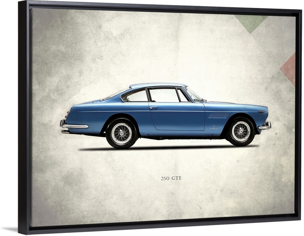 <p>Photograph of a blue Ferrari 250GTE 1962 printed on a distressed white and gray background with part of the Italian flag in the top right corner.</p>