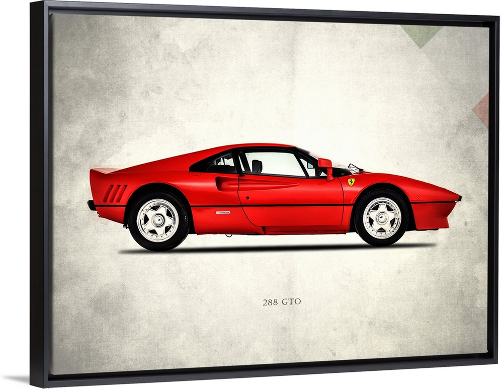 <p>Photograph of a red Ferrari 288 printed on a distressed white and gray background with part of the Italian flag in the top right corner.</p>