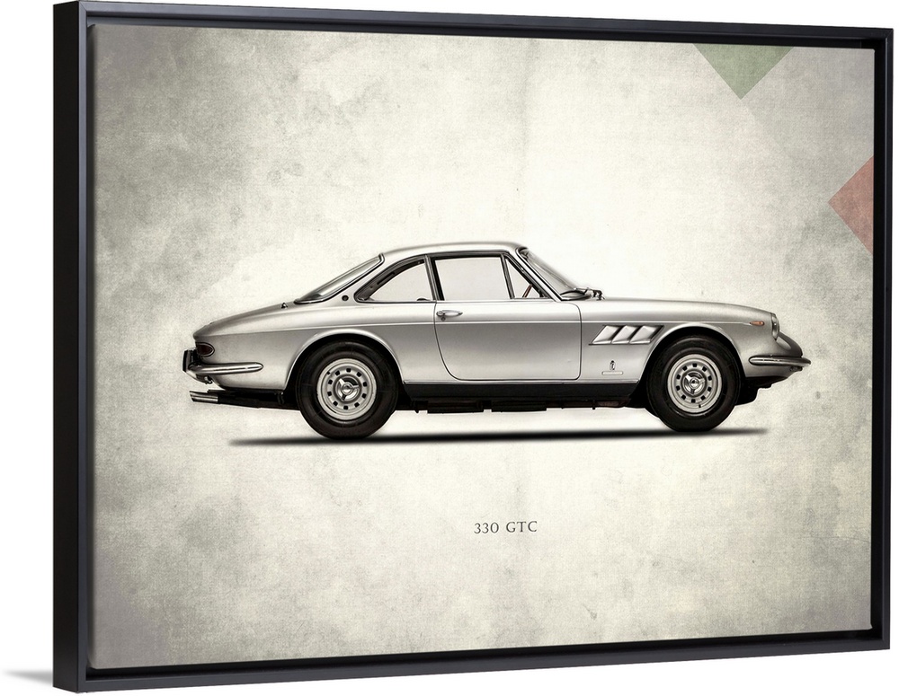 <p>Photograph of a silver Ferrari 330GTC 1968 printed on a distressed white and gray background with part of the Italian flag in the top right corner.</p>
