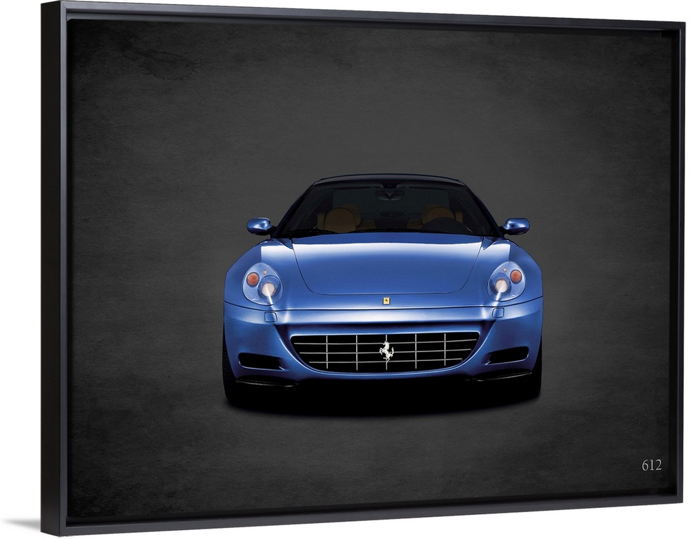 <p>Photograph of a blue Ferrari 612 printed on a black background with a dark vignette.</p>