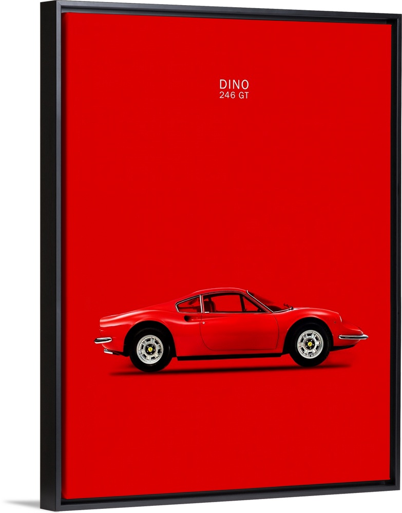 <p>Photograph of a bright red Ferrari Dino 246GT 69 printed on a red background</p>