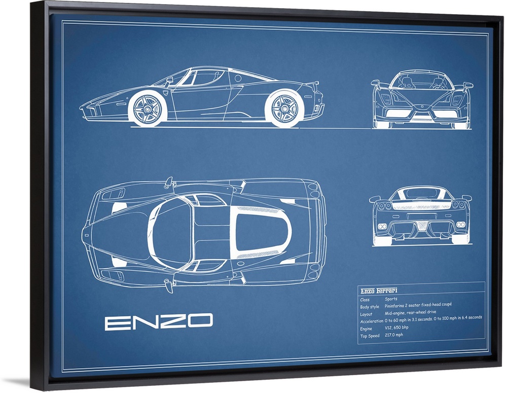 <p>Antique style blueprint diagram of a Ferrari Enzo printed on a Blue background.</p>