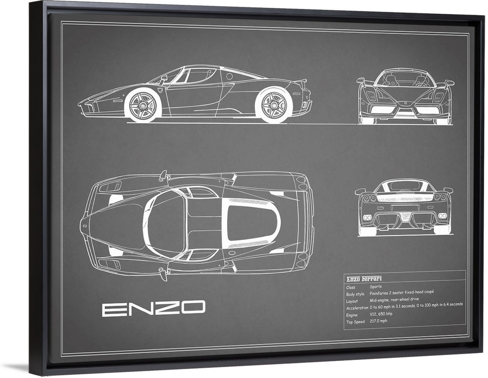 <p>Antique style blueprint diagram of a Ferrari Enzo printed on a Grey background.</p>