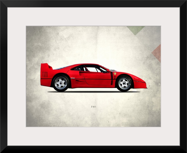 <p>Photograph of a red Ferrari F40 Berlinette 1992 printed on a distressed white and gray background with part of the Italian flag in the top right corner.</p>