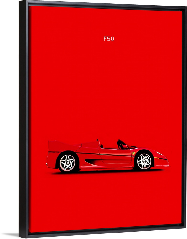 <p>Photograph of a bright red Ferrari F50 printed on a red background</p>