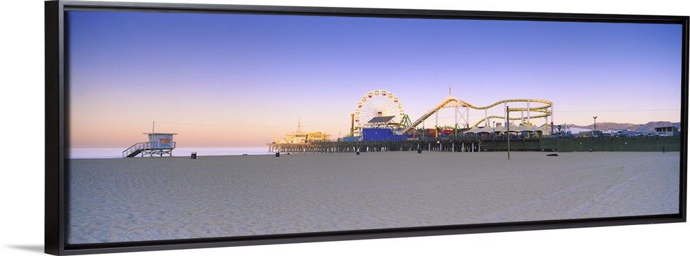 <p>This is a panoramic photograph of a board walk carnival taken from a sandy beach at twilight.</p>