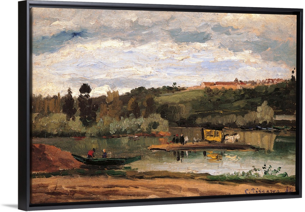 <p>Ferry at Varenne Saint Hilaire, by Camille Pissarro, 1864, 19th Century, canvas, cm 27 x 41 - France, Ile de France, Paris, Muse dOrsay, RF1951-38. All. Canal river water sky clouds grey green wood trees bank boat houses. (246314) Everett Collection\Monda</p>
