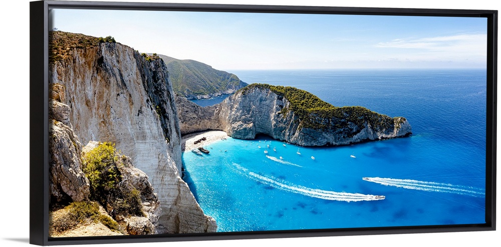 <p>Ferry boats in the turquoise lagoon surrounding the iconic Shipwreck Beach (Navagio Beach), aerial view, Zakynthos, Greek Islands, Greece, Europe</p>